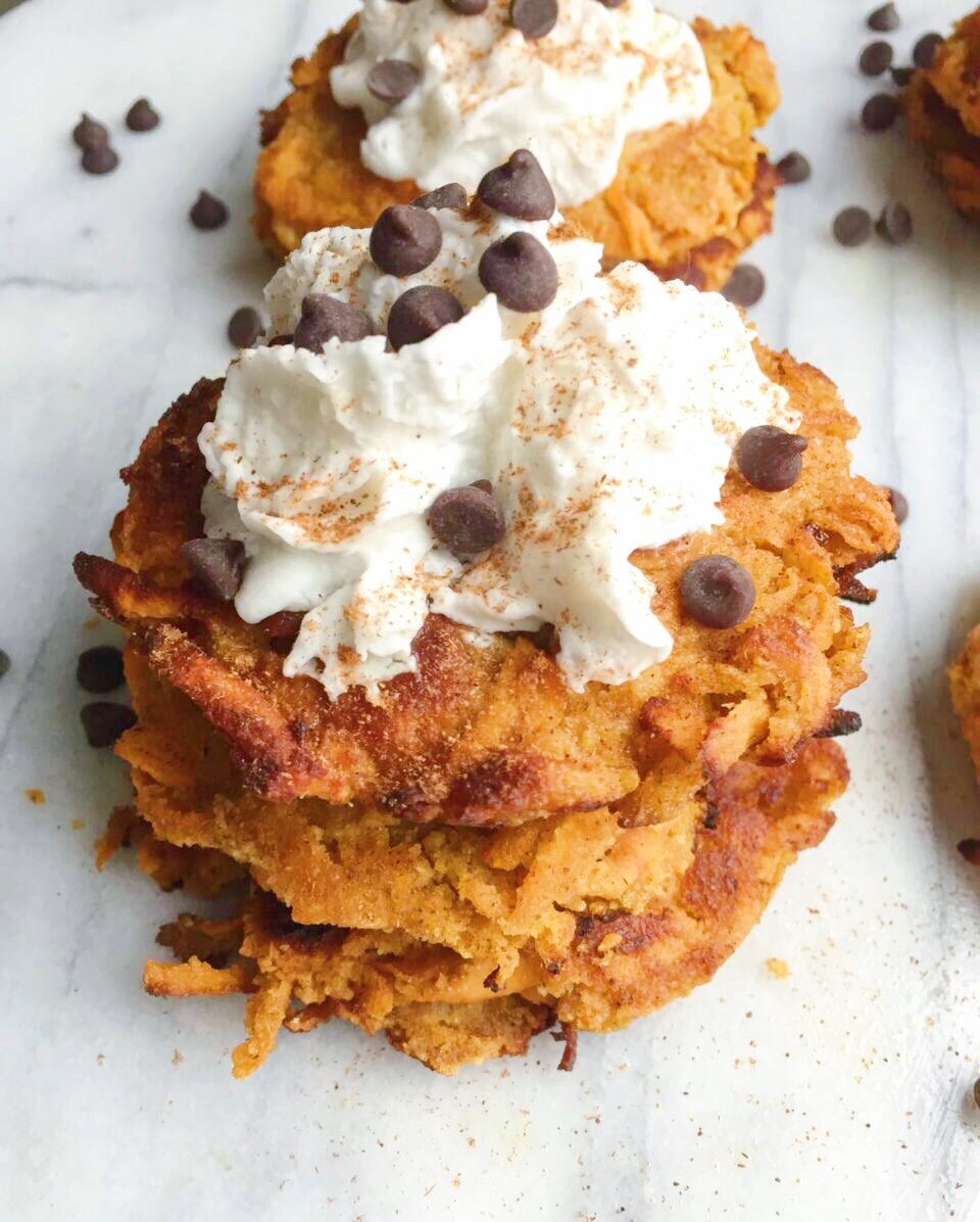 No, but seriously- is there anything better than a hot & perfectly crispy on the outside, tender on the inside sweet potato fritter? What if I told you they’re spiced with ground cinnamon, fancy molasses, nutmeg, ground vanilla bean, a pinch of sea salt & topped with homemade coconut whipped cream, dark chocolate chips, or walnuts & golden raisins? Um, yeah- I didn’t think so.